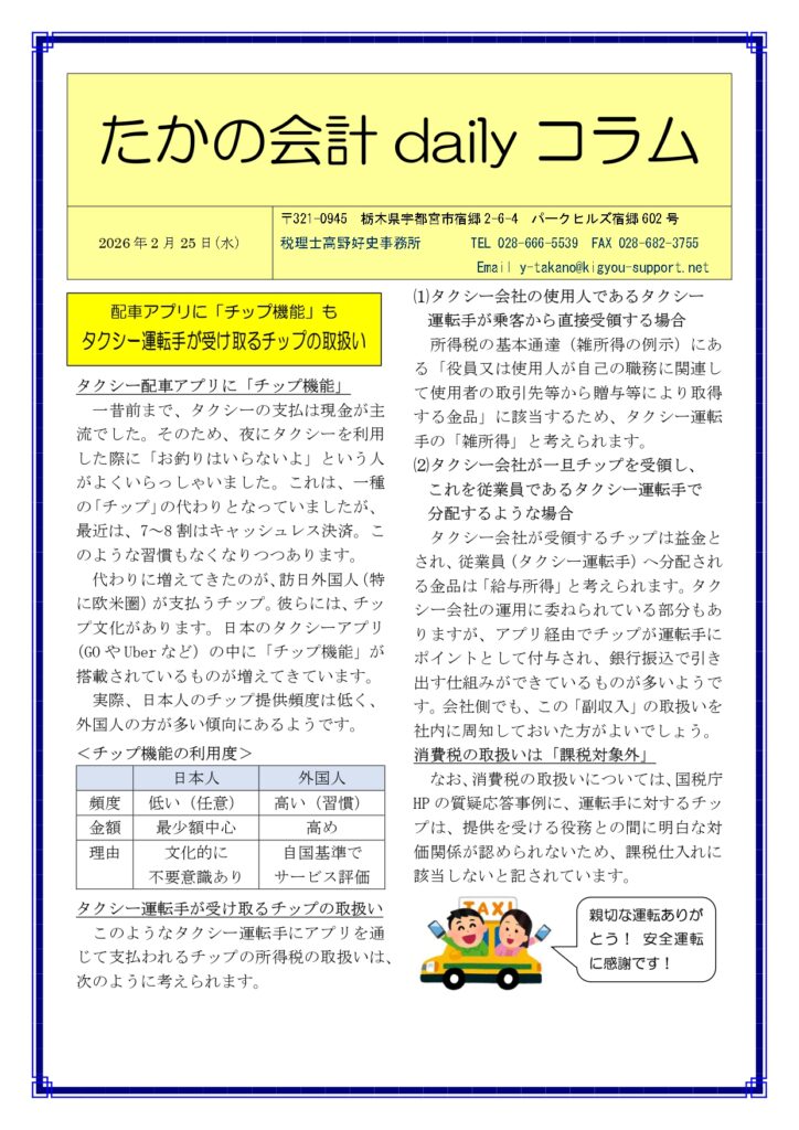 タクシー会社が受領するチップは益金とされ、従業員(タクシー運転手)へ分配される金品は「給与所得」と考えられます。タクシー会社の運用に委ねられている部分もありますが、アプリ経由でチップが運転手にポイントとして付与され、銀行振込で引き出す仕組みができているものが多いようです。会社側でも、この「副収入」の取扱いを社内に周知しておいた方がよいでしょう。