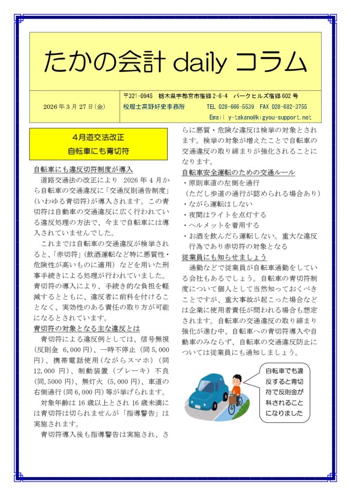 道路交通法の改正により 2026年4月から自転車の交通違反に「交通反則通告制度」(いわゆる青切符)が導入されます。この青切符は自動車の交通違反に広く行われている違反処理の方法で、今まで自転車には導入されていませんでした。