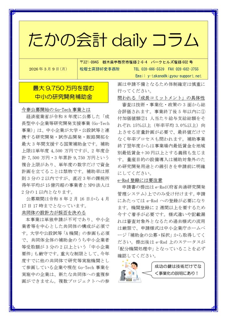 経済産業省が令和8年度に公募した「成長型中小企業等研究開発支援事業(Go-Tech事業)」は、中小企業が大学・公設試等と連携する研究開発・試作品開発・販路開拓を最大3年間支援する国策補助金です。補助上限は単年度4,500万円ですが、2年度合計7,500万円・3年累計9,750万円という複合上限があり、単年度の数字だけで資金計画を立てることは禁物です。補助率は原則3分の2以内ですが、直近3年の課税所得年平均が15億円超の事業者とNPO法人は2分の1以内となります。