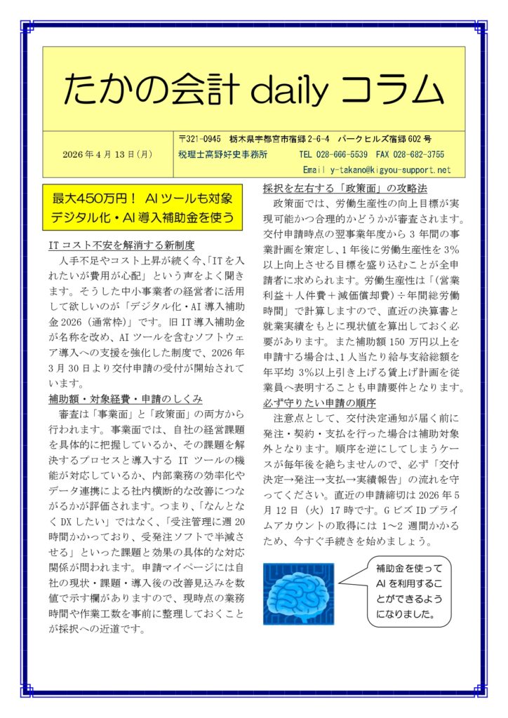 人手不足やコスト上昇が続く今、「ITを入れたいが費用が心配」という声をよく聞きます。そうした中小事業者の経営者に活用して欲しいのが「デジタル化・AI導入補助金2026(通常枠)」です。旧IT導入補助金が名称を改め、AIツールを含むソフトウェア導入への支援を強化した制度で、2026年3月30日より交付申請の受付が開始されています。