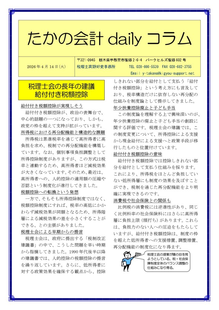税理士会は、政府に提出する「税制改正建議書」の中で、こうした問題を早い時期から指摘してきました。1990年代後半以降の建議書では、人的控除の税額控除の提言を繰り返しています。さらに、低所得者に対する政策効果を確保する観点から、控除しきれない部分を給付として支払う「給付付き税額控除」という考え方にも言及しており、税率構造だけに依存しない再分配の仕組みを制度論として提示してきました。