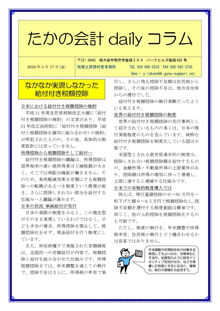 | 年末調整や所得税申告の対象外を無視してもよいのか、世帯単位にするか、米国型のように就労インセンティブを効かせか、なども考慮した制度とするとなると、複雑化、執行の煩雑化も起きそう。 |