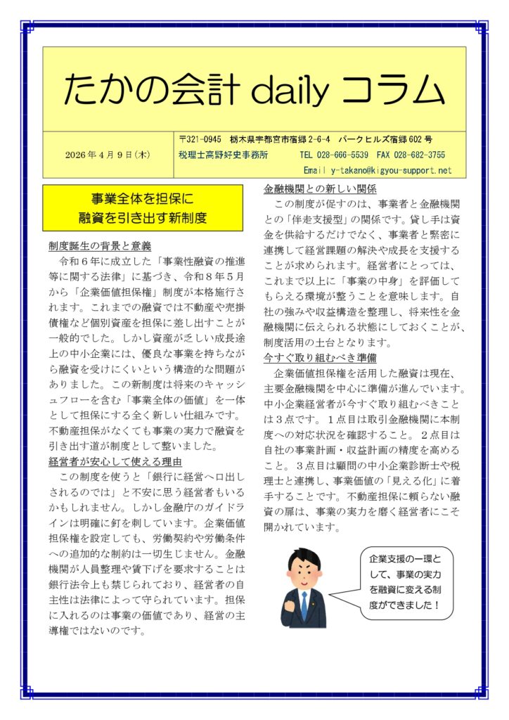 令和6年に成立した「事業性融資の推進等に関する法律」に基づき、令和8年5月から「企業価値担保権」制度が本格施行されます。これまでの融資では不動産や売掛債権など個別資産を担保に差し出すことが一般的でした。しかし資産が乏しい成長途上の中小企業には、優良な事業を持ちながら融資を受けにくいという構造的な問題がありました。この新制度は将来のキャッシュフローを含む「事業全体の価値」を一体として担保にする全く新しい仕組みです。不動産担保がなくても事業の実力で融資を引き出す道が制度として整いました。