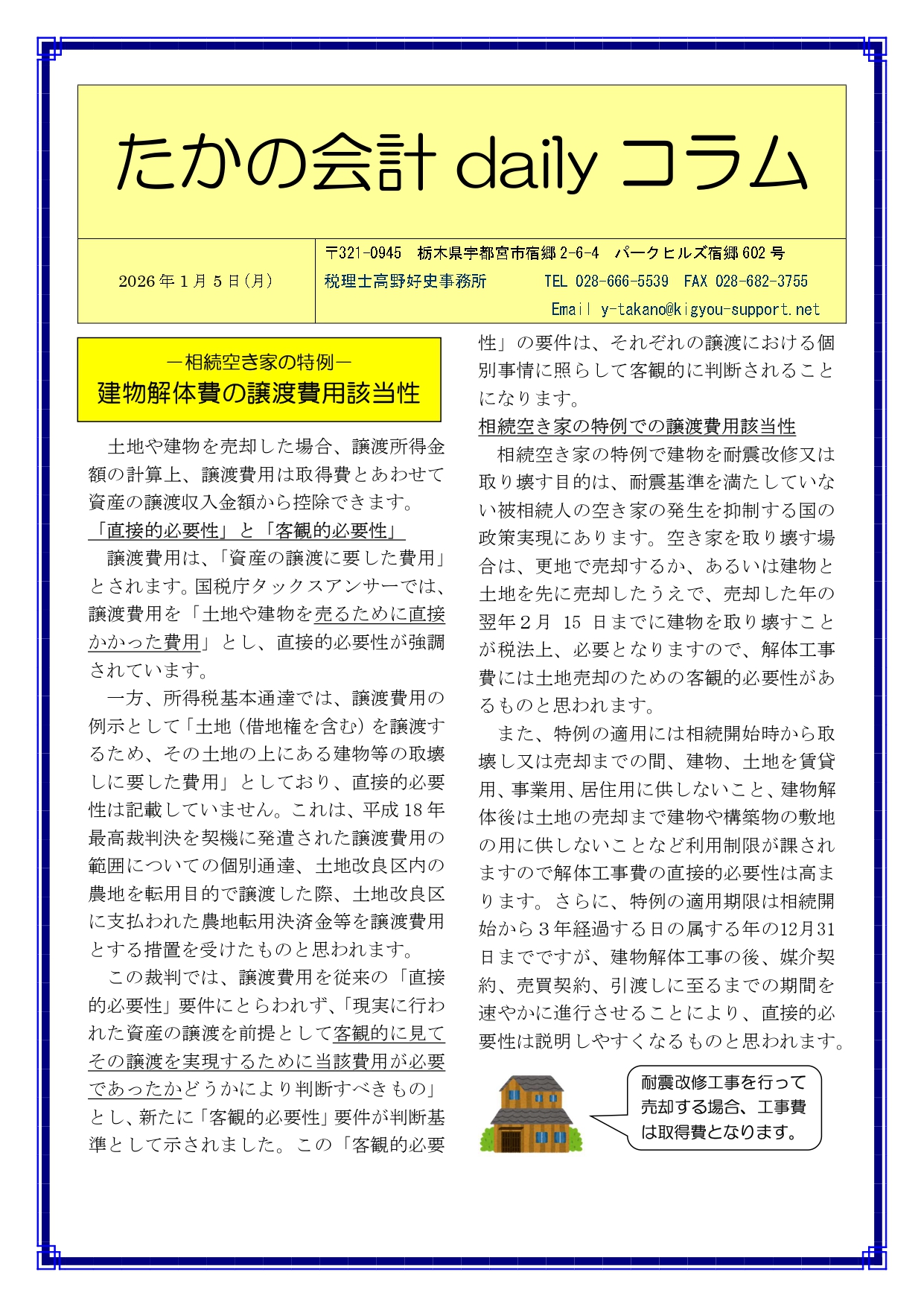 Previous Post: −相続空き家の特例−建物解体費の譲渡費用該当性