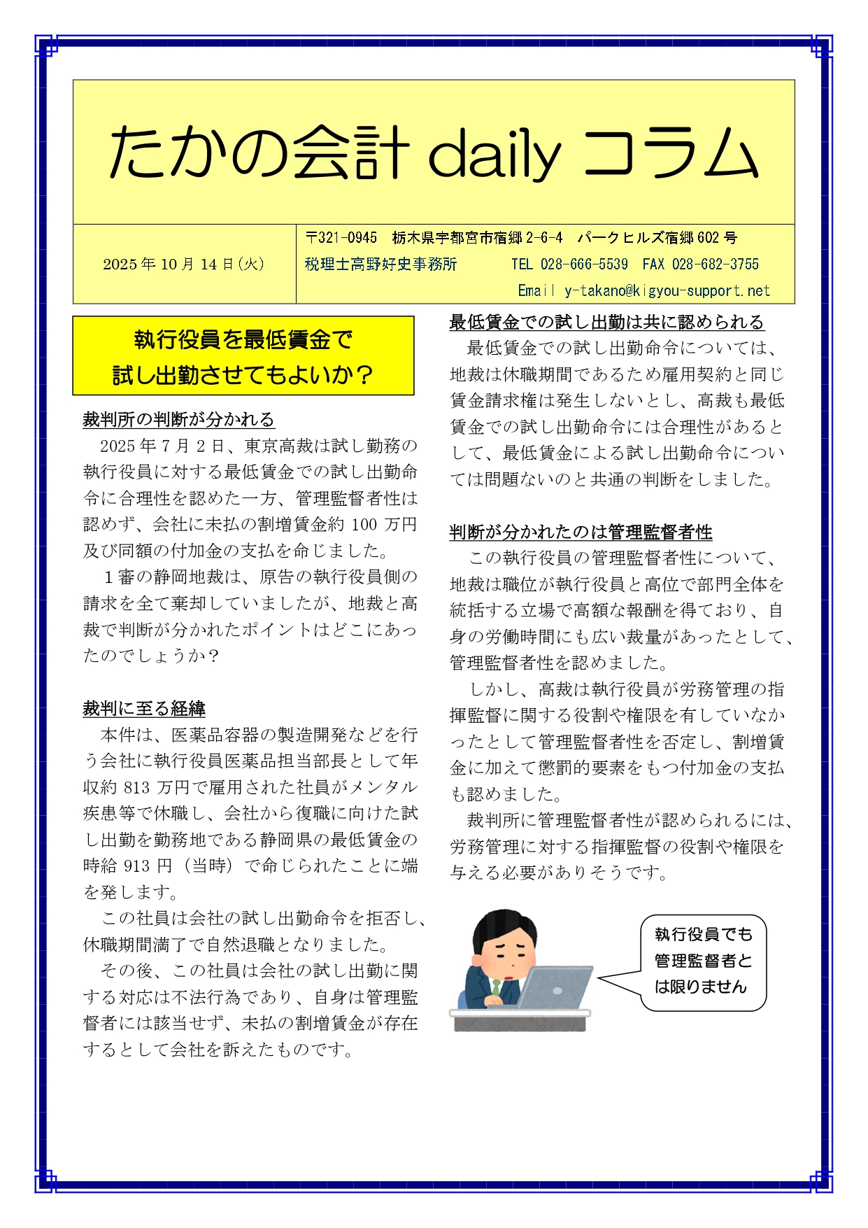 Previous Post: 執行役員を最低賃金で試し出勤させてもよいか?