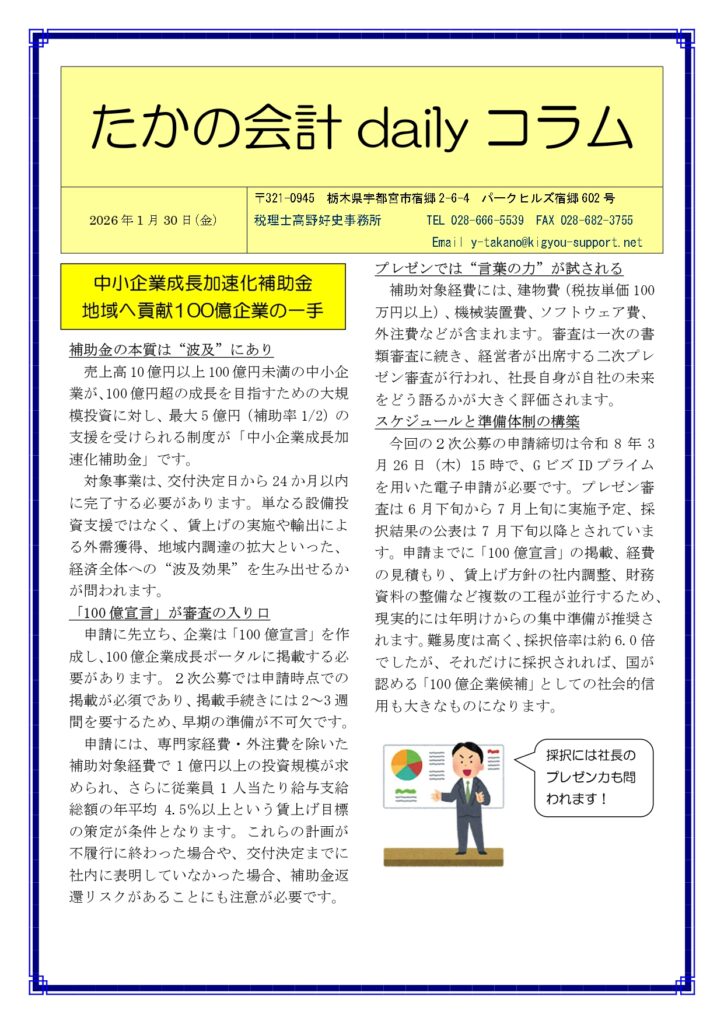 売上高10億円以上100億円未満の中小企業が、100億円超の成長を目指すための大規模投資に対し、最大5億円(補助率1/2)の支援を受けられる制度が「中小企業成長加速化補助金」です。