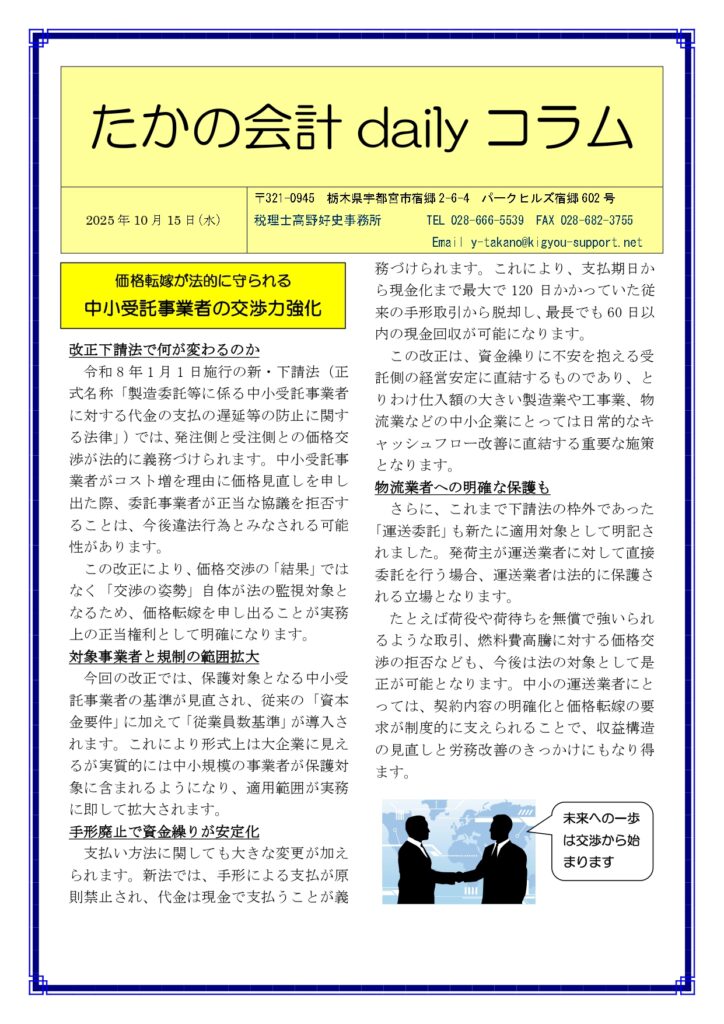 令和8年1月1日施行の新・下請法(正式名称「製造委託等に係る中小受託事業者に対する代金の支払の遅延等の防止に関する法律」)では、発注側と受注側との価格交渉が法的に義務づけられます。中小受託事業者がコスト増を理由に価格見直しを申し出た際、委託事業者が正当な協議を拒否することは、今後違法行為とみなされる可能性があります。