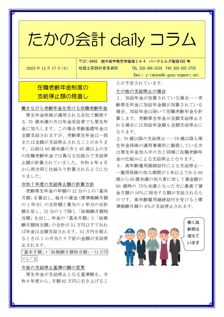 2.70歳以降の支給停止……70歳以降も厚生年金保険の適用事業所に勤務している方は厚生年金加入中の方と同様に在職老齢年金の仕組みによる支給停止となります。