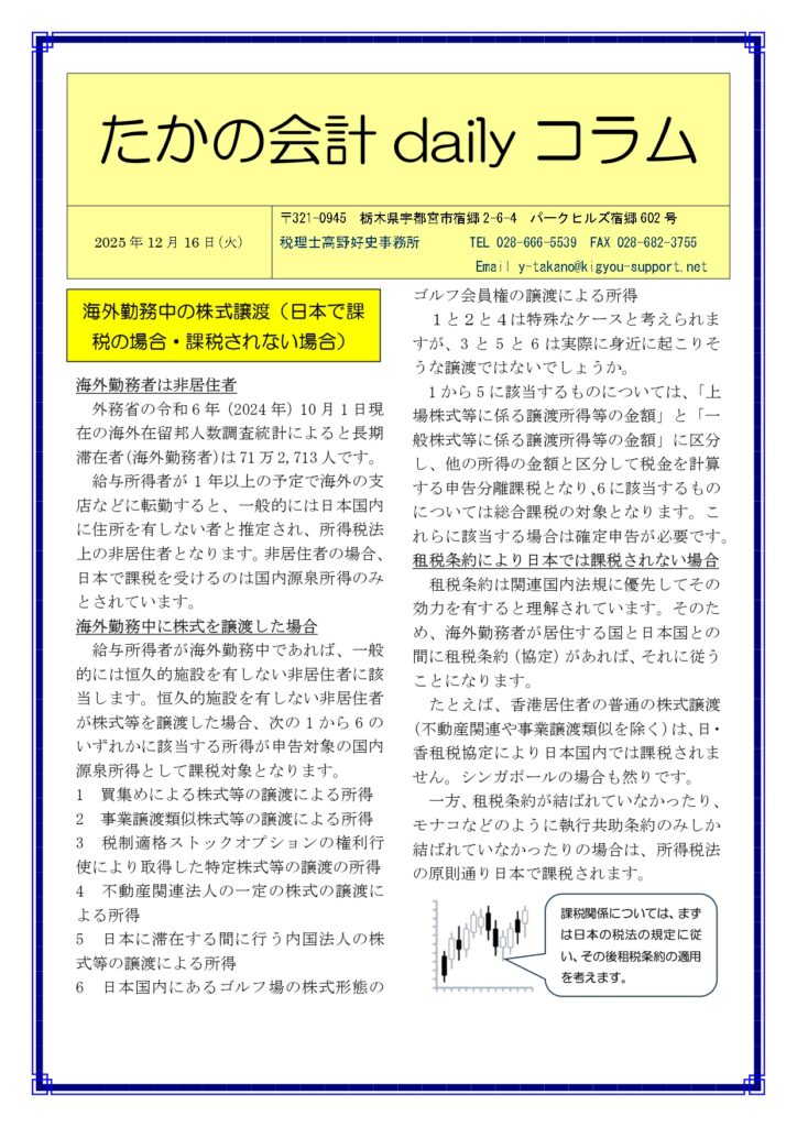 租税条約は関連国内法規に優先してその効力を有すると理解されています。そのため、海外勤務者が居住する国と日本国との間に租税条約(協定)があれば、それに従うことになります。