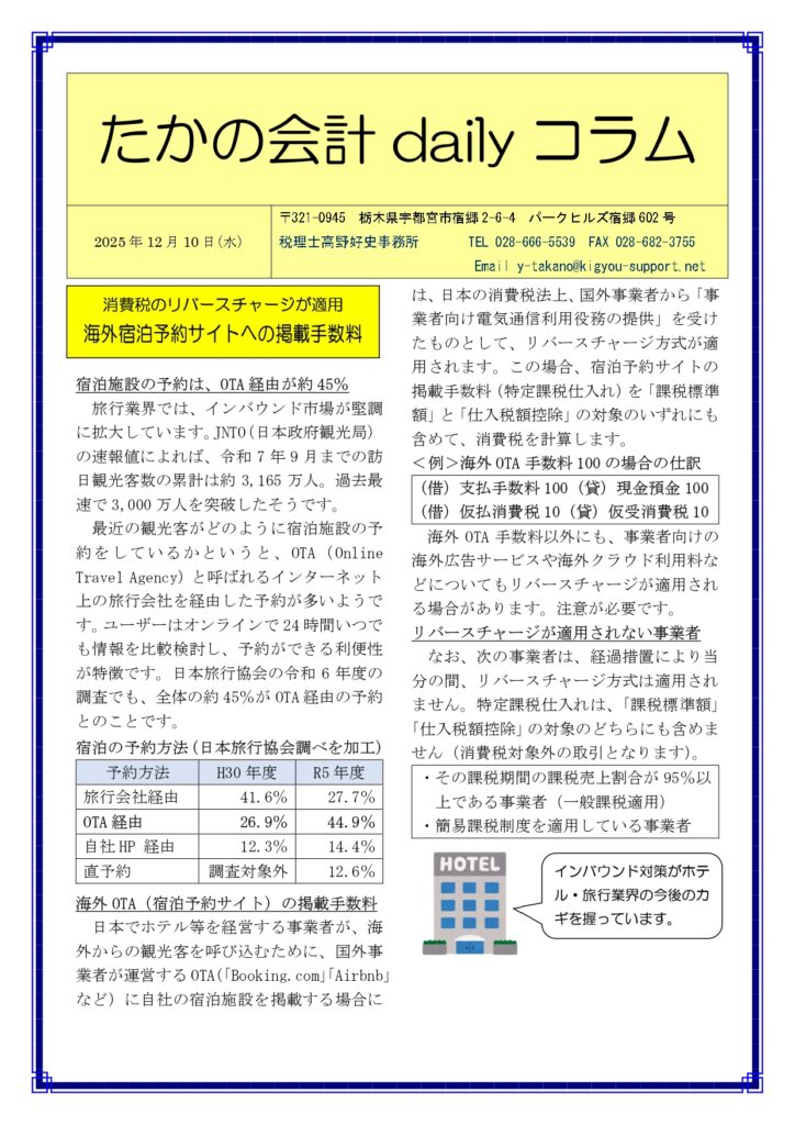 海外OTA手数料以外にも、事業者向けの海外広告サービスや海外クラウド利用料などについてもリバースチャージが適用される場合があります。注意が必要です。