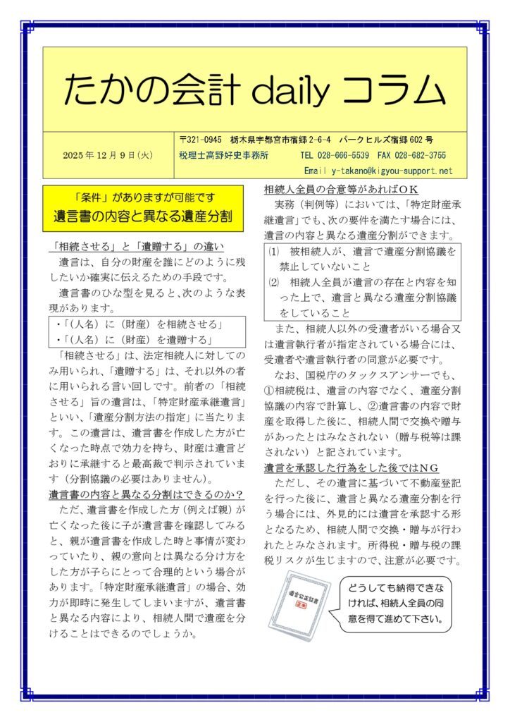 なお、国税庁のタックスアンサーでも、①相続税は、遺言の内容でなく、遺産分割協議の内容で計算し、②遺言書の内容で財産を取得した後に、相続人間で交換や贈与があったとはみなされない(贈与税等は課されない)と記されています。