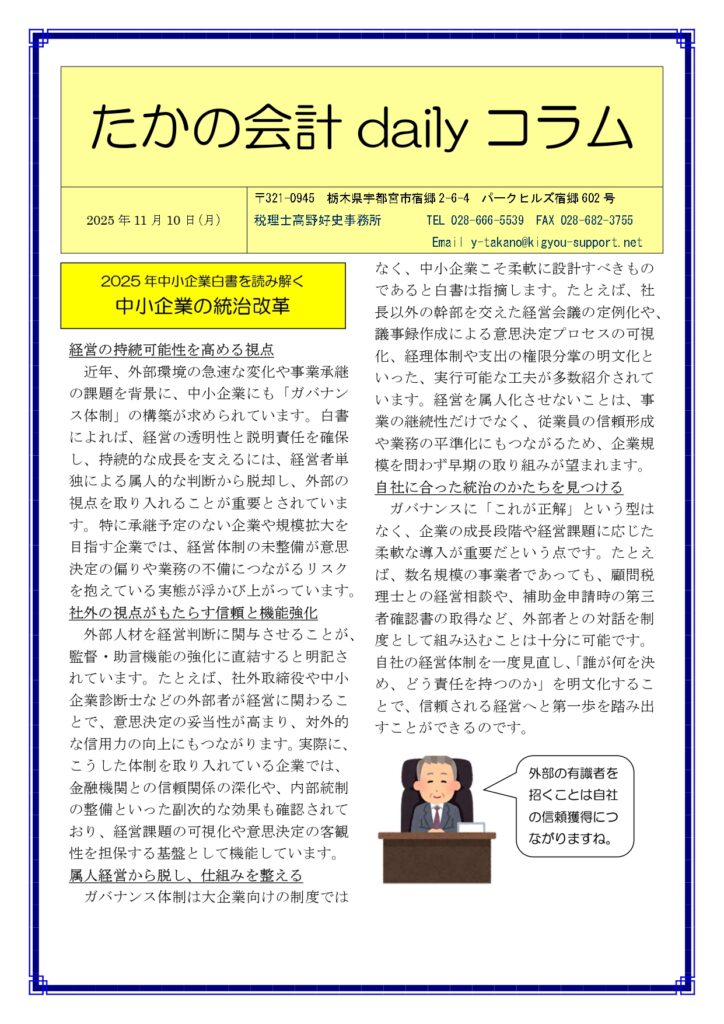 ガバナンスに「これが正解」という型はなく、企業の成長段階や経営課題に応じた柔軟な導入が重要だという点です。たとえば、数名規模の事業者であっても、顧問税理士との経営相談や、補助金申請時の第三者確認書の取得など、外部者との対話を制度として組み込むことは十分に可能です。自社の経営体制を一度見直し、「誰が何を決め、どう責任を持つのか」を明文化することで、信頼される経営へと第一歩を踏み出すことができるのです。