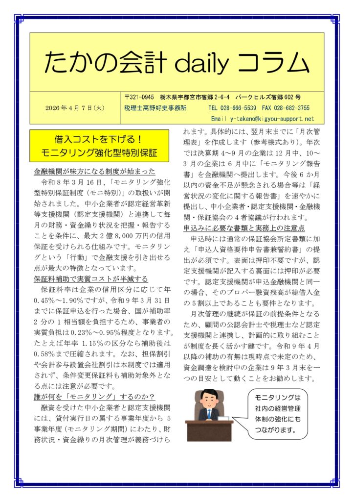 令和8年3月16日、「モニタリング強化型特別保証制度(モニ特別)」の取扱いが開始されました。中小企業者が認定経営革新等支援機関(認定支援機関)と連携して毎月の財務・資金繰り状況を把握・報告することを条件に、最大2億8,000万円の信用保証を受けられる仕組みです。モニタリングという「行動」で金融支援を引き出せる点が最大の特徴となっています。