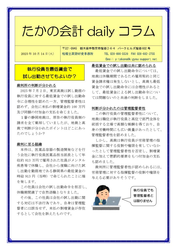 2025年7月2日、東京高裁は試し勤務の執行役員に対する最低賃金での試し出勤命令に合理性を認めた一方、管理監督者性は認めず、会社に未払の割増賃金約100万円及び同額の付加金の支払を命じました。