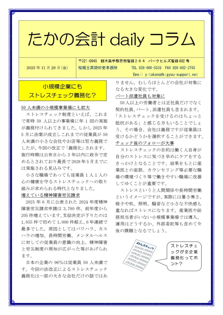 ストレスチェック制度といえば、これまで常時50人以上の事業場に年1回の実施が義務付けられてきました。しかし2025年5月に法案が成立しこれまでの従業員が50人未満の小さな会社やお店等は努力義務でしたが、今回の改正で「義務化」されます。施行時期は公布日から3年以内に政令で定めるとされており最長で2028年5月までには実施される見込みです。