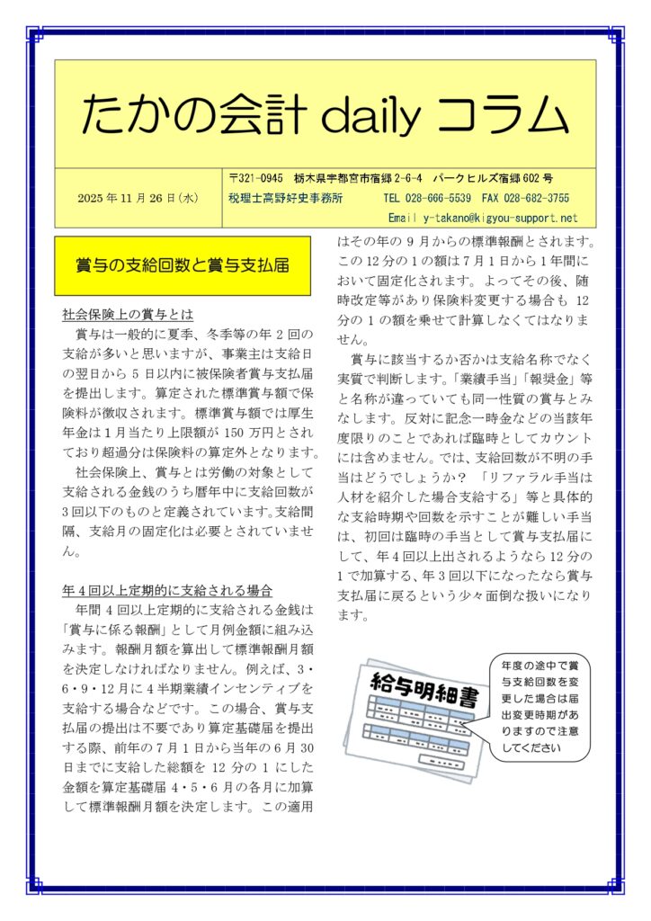 賞与の支給回数と賞与支払届