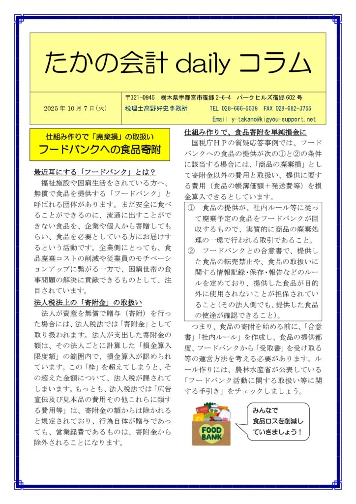 国税庁HPの質疑応答事例では、フードバンクへの食品の提供が次の①と②の条件に該当する場合には、「商品の廃棄損」として寄附金以外の費用と取扱い、提供に要する費用(食品の帳簿価額+発送費等)を損金算入できるとしています。