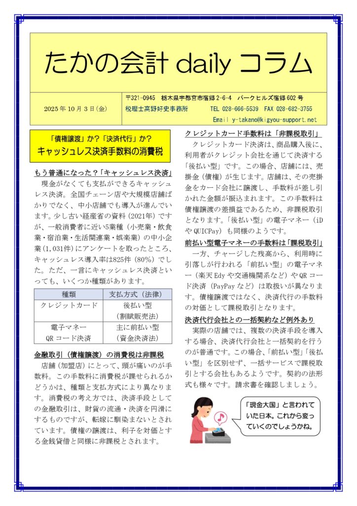 店舗(加盟店)にとって、頭が痛いのが手数料。この手数料に消費税が課せられるかどうかは、種類と支払方式により異なります。消費税の考え方では、決済手段としての金融取引は、財貨の流通・決済を円滑にするものですが、転嫁に馴染まないとされています。債権の譲渡は、利子を対価とする金銭貸借と同様に非課税とされます。