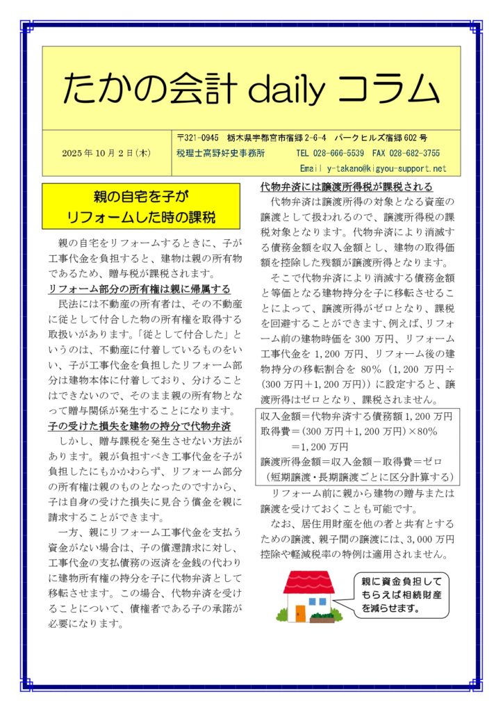親の自宅を子がリフォームした時の課税