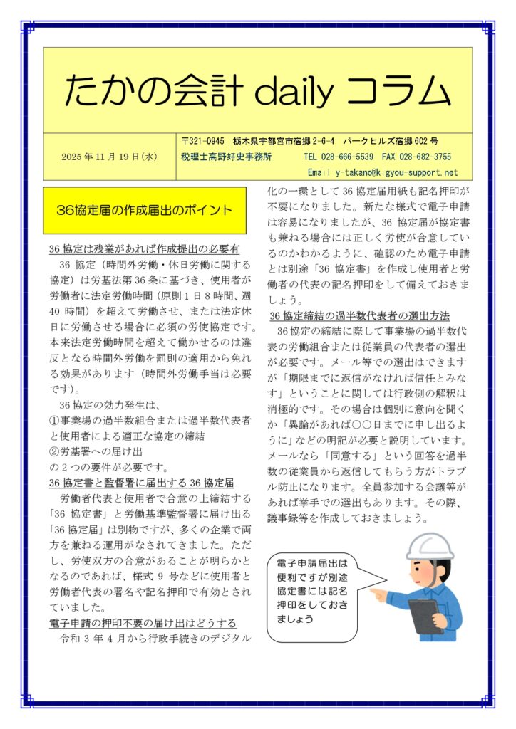 令和3年4月から行政手続きのデジタル化の一環として36協定届用紙も記名押印が不要になりました。新たな様式で電子申請は容易になりましたが、36協定届が協定書も兼ねる場合には正しく労使が合意しているのかわかるように、確認のため電子申請とは別途「36協定書」を作成し使用者と労働者の代表の記名押印をして備えておきましょう。